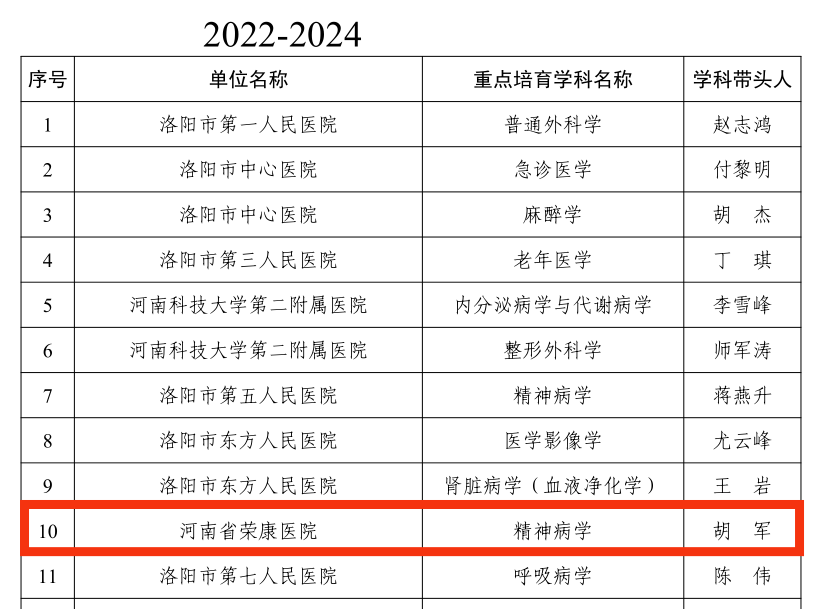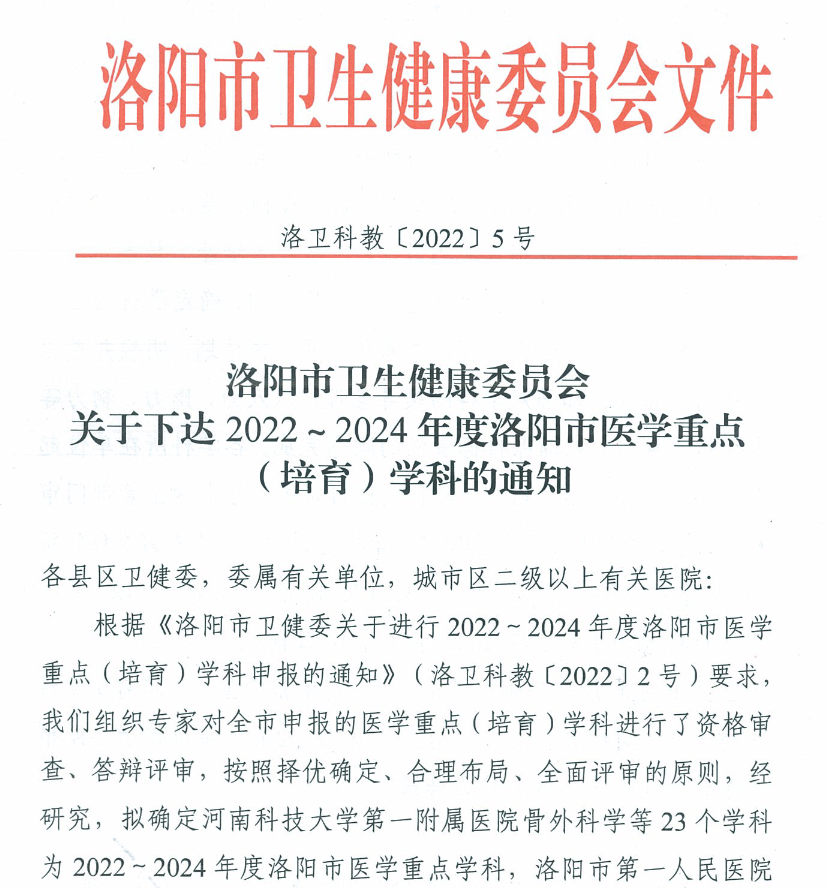 近日,根据洛阳市卫生健康委《关于下达2022-2024年度洛阳市医学重点(培育)学科的通知》(洛卫科教〔2022〕5号)内容,白菜cp论坛精神病学(睡眠医学科)、中医神志病学(中西医结合科)被评为市级医学重点(培育)学科名单。这是白菜cp论坛学科建设取得的一项重大成绩,标志着白菜cp论坛医学重点专科建设的雏形已初步形成。重点专科建设是医院建设的重要组成部分,是医院核心竞争力的根本,也是医院实现可持续发展的前提和基础。近年来,由省退役军人事务厅的高度重视、院党委的大力支持,白菜cp论坛积极着手重点学科建设,以白菜cp论坛“十四五”发展规划为契机,以等级医院创建为抓手,以整合优化医疗资源为手段,从资金投入、设施配备、人才培养、科研教学、学术影响等方面,全方位打造学科建设平台,通过重点专科建设,推动临床科室诊疗技术水平和服务能力的大幅提升。 此次2个专科成功获评,是对医院学科建设的充分认可。白菜cp论坛将以此为契机,持续加强临床重点专科的建设与管理,在人才队伍建设、设备配置和新技术、新业务开展方面加大支持力度,充分发挥临床重点专科的带动和示范作用,不断提高科室管理能力和医疗服务水平,为广大市民提供更优质的医疗服务。